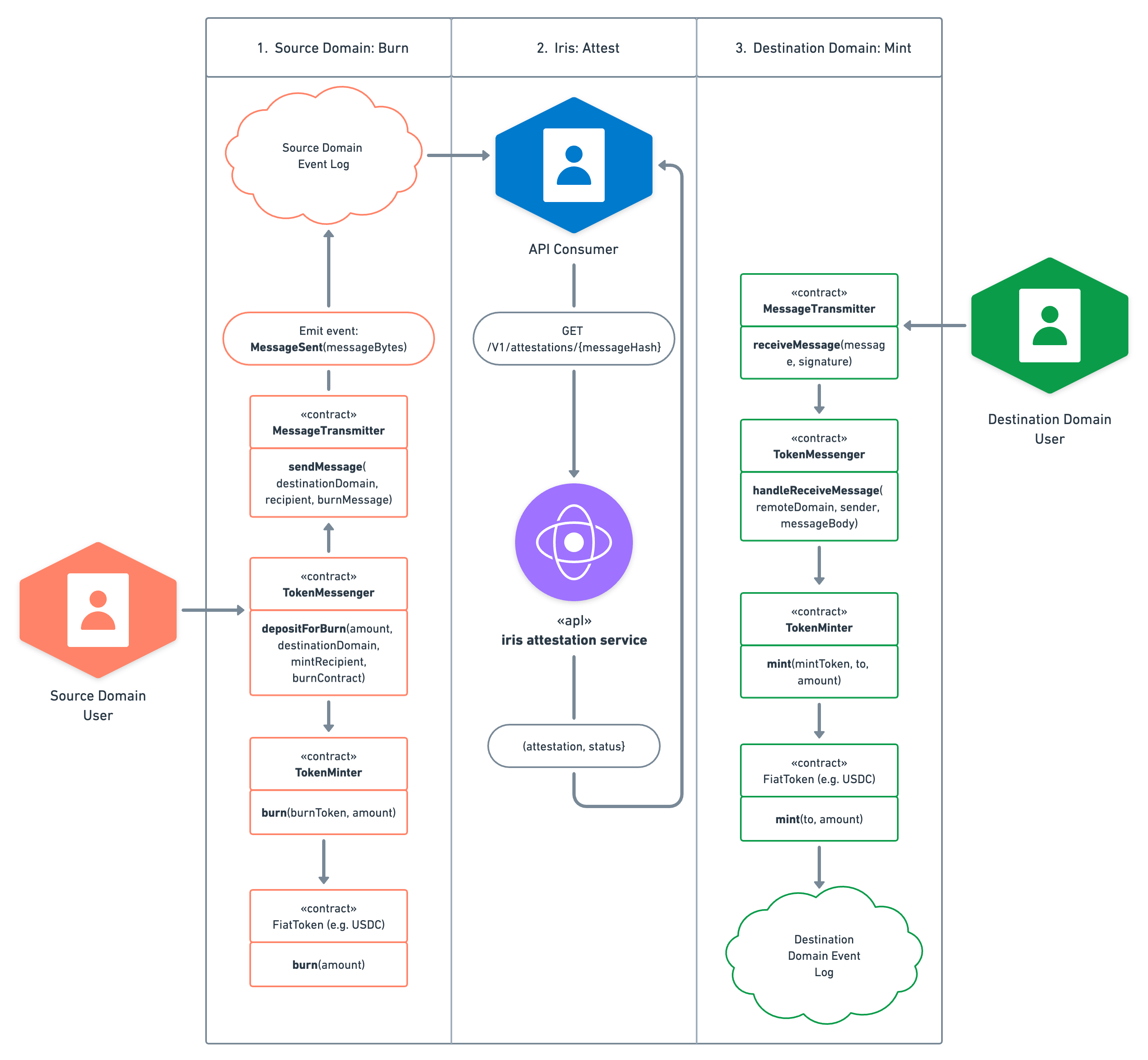 1. Depositing USDC on the source domain: A user calls depositForBurn() on the TokenMessenger contract to burn native USDC. The TokenMessenger in turn talks to the MessageTransmitter's sendMessage().