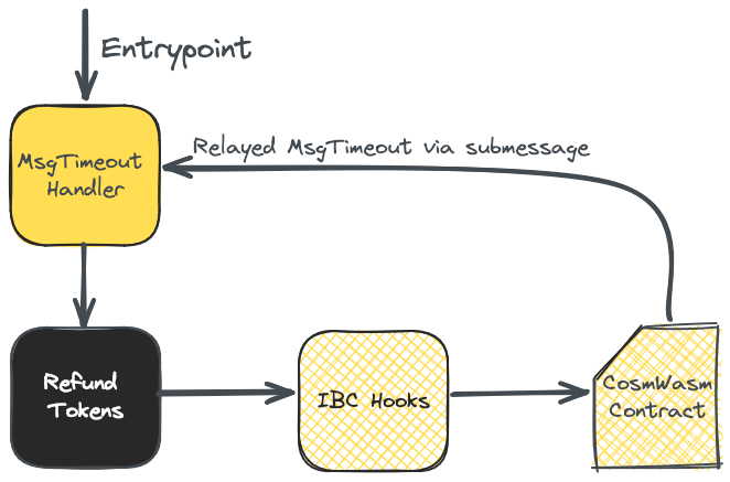- A callback into CosmWasm is made via IBC hooks in the middle of the MsgTimeout message.