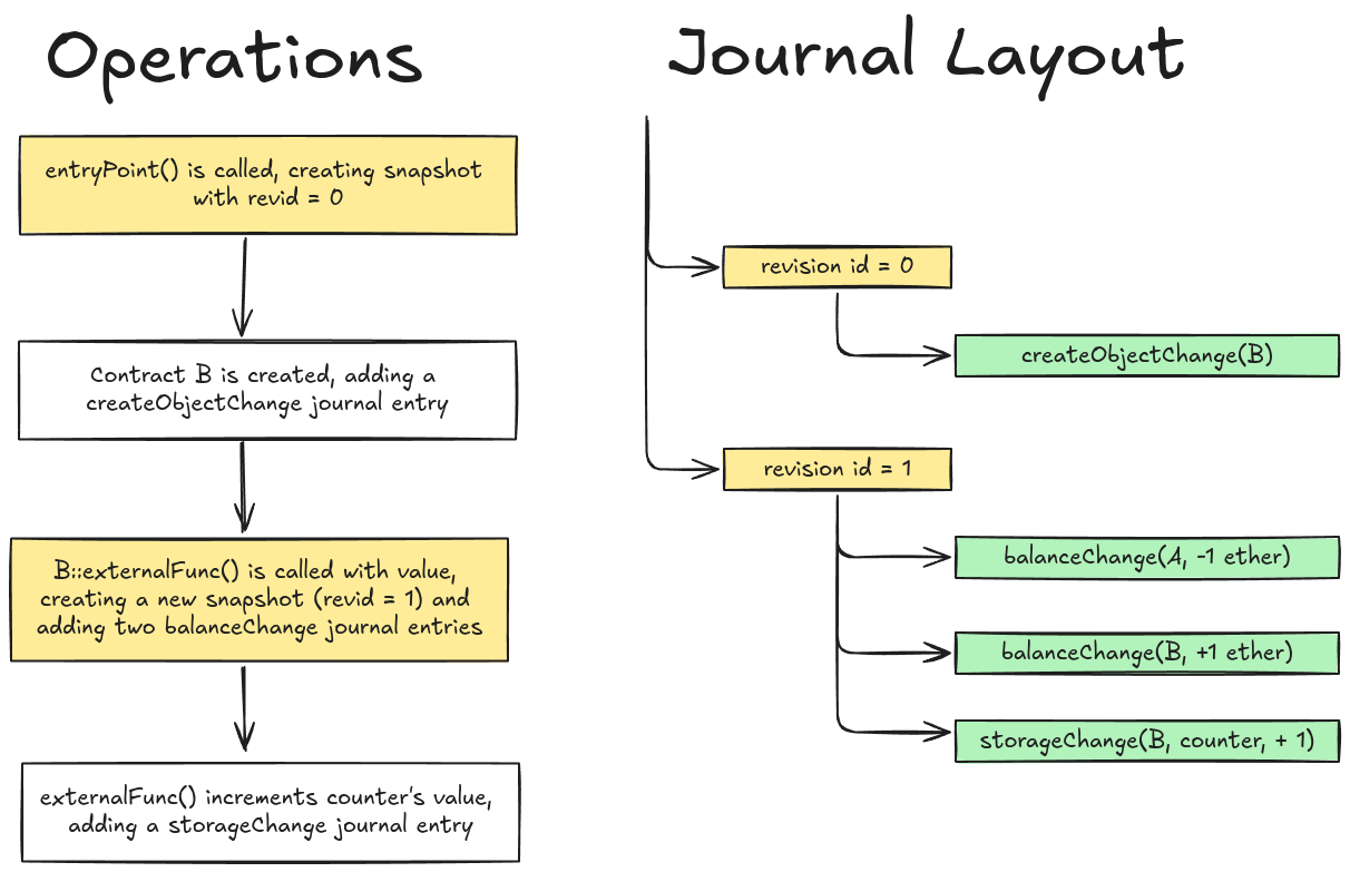 During smart contract execution in an EVM environment, multiple important mechanisms ensure that the state is managed correctly, especially in the event of reverts. The net result should be a new state that can be committed and used by the following transaction. For this post, the following EVM mechanisms are of particular interest: