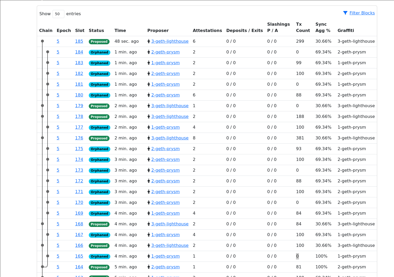 We built a local devnet composed of three nodes: one “malicious” Prysm patched as described, one “pristine” Prysm, and one “pristine” Lighthouse, all connected to their own Geth instances. As shown in the figures below, the network partitions into two chains first: