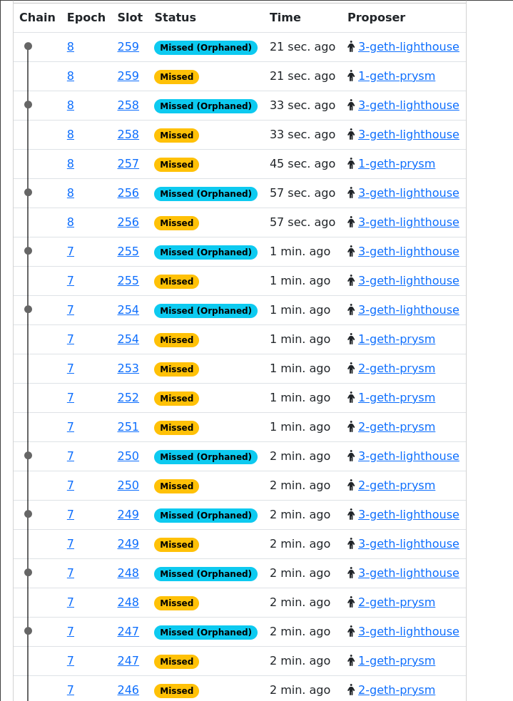 [cl-3-lighthouse-geth] Jun 07 12:40:41.270 WARN Could not publish message kind: sync_committee_0, error: InsufficientPeersThe final result is that, from the blockchain's point of view, the network halts completely because new blocks cannot be produced.